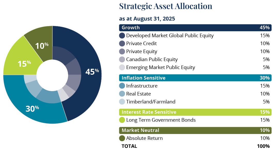 Strategic asset allocation is a key driver of long-term investment returns. The chart below shows the asset mix approved by the ATRF Board as part of its 2024 review and implemented throughout 2025.